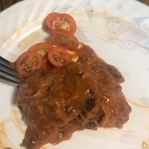 Equal parts of cream of mushroom soup and tomato sauce. ( sometimes I sub in a can of Rotel or of fire-roasted tomatoes for one of the cans of tomato sauce....this was done the first time because I ran out of sauce but we LOVED it so I often do this! You will likely need at least 4 cans (2 each) -- but it can expand as much as you decide to make! I sprinkle in some onion powder and garlic powder because I add that to everything!